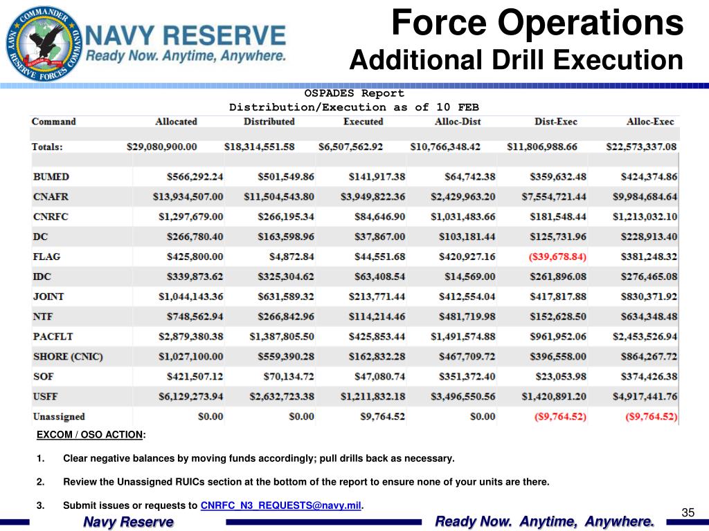 Force OperationsAdditional Drill Execution OSPADES Report Distribution/Execution as of 10 FEB EXCOM / OSO ACTION: Clear negative balances by moving funds accordingly; pull drills back as necessary. Review the Unassigned RUICs section at the bottom of the report to ensure none of your units are there. Submit issues or requests to CNRFC_N3_REQUESTS@navy.mil.