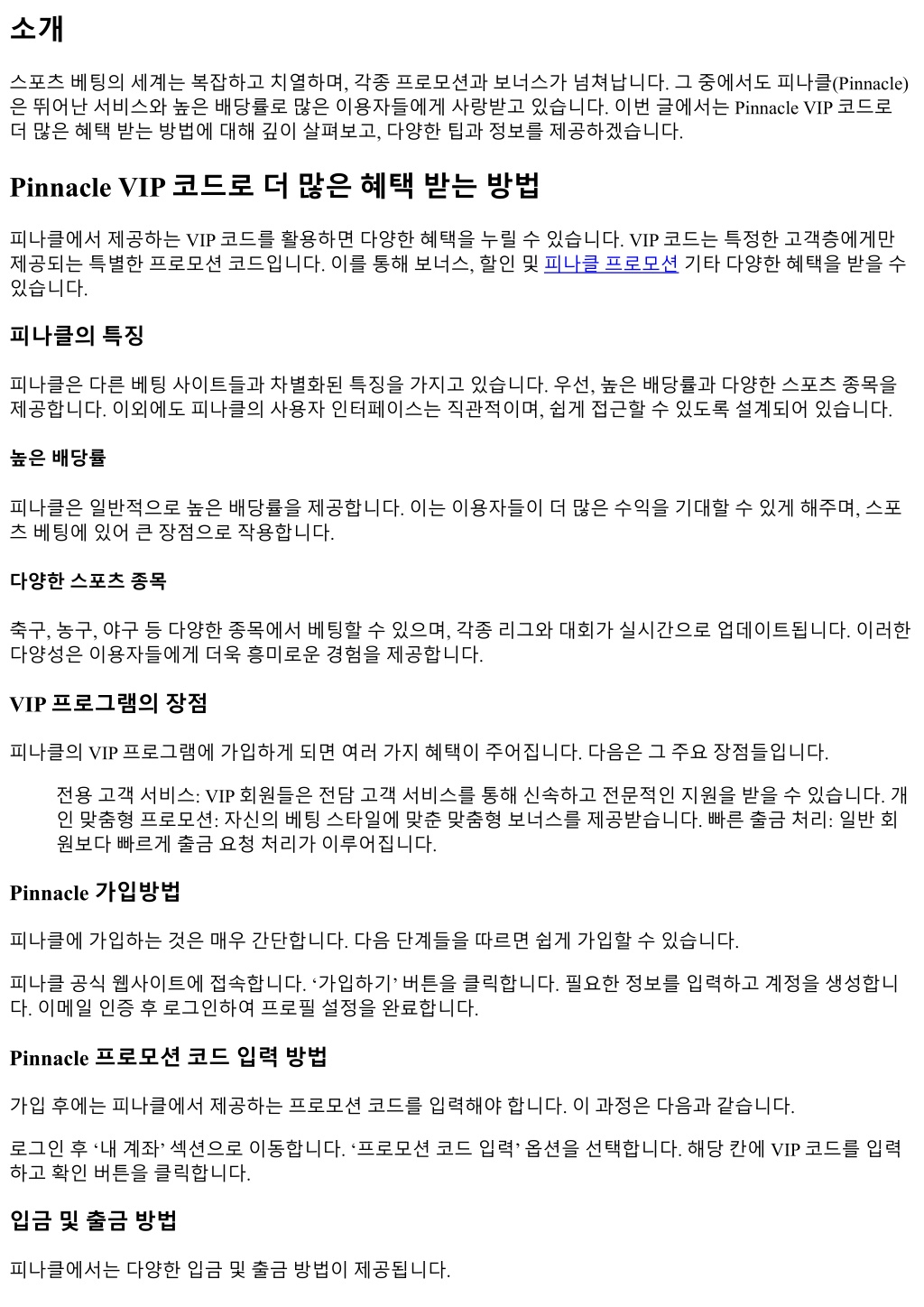 1. 소개 스포츠베팅의세계는복잡하고치열하며, 각종프로모션과보너스가넘쳐납니다. 그중에서도피나클(Pinnacle) 은뛰어난서비스와높은배당률로많은이용자들에게사랑받고있습니다. 이번글에서는 Pinnacle VIP 코드로 더많은혜택받는방법에대해깊이살펴보고, 다양한팁과정보를제공하겠습니다. Pinnacle VIP 코드로더많은혜택받는방법 피나클에서제공하는 VIP 코드를활용하면다양한혜택을누릴수있습니다. VIP 코드는특정한고객층에게만 제공되는특별한프로모션코드입니다. 이를통해보너스, 할인및피나클프로모션기타다양한혜택을받을수 있습니다. 피나클의특징 피나클은다른베팅사이트들과차별화된특징을가지고있습니다. 우선, 높은배당률과다양한스포츠종목을 제공합니다. 이외에도피나클의사용자인터페이스는직관적이며, 쉽게접근할수있도록설계되어있습니다. 높은배당률 피나클은일반적으로높은배당률을제공합니다. 이는이용자들이더많은수익을기대할수있게해주며, 스포 츠베팅에있어큰장점으로작용합니다. 다양한스포츠종목 축구, 농구, 야구등다양한종목에서베팅할수있으며, 각종리그와대회가실시간으로업데이트됩니다. 이러한 다양성은이용자들에게더욱흥미로운경험을제공합니다. VIP 프로그램의장점 피나클의 VIP 프로그램에가입하게되면여러가지혜택이주어집니다. 다음은그주요장점들입니다. 전용고객서비스: VIP 회원들은전담고객서비스를통해신속하고전문적인지원을받을수있습니다. 개 인맞춤형프로모션: 자신의베팅스타일에맞춘맞춤형보너스를제공받습니다. 빠른출금처리: 일반회 원보다빠르게출금요청처리가이루어집니다. Pinnacle 가입방법 피나클에가입하는것은매우간단합니다. 다음단계들을따르면쉽게가입할수있습니다. 피나클공식웹사이트에접속합니다. ‘가입하기’ 버튼을클릭합니다. 필요한정보를입력하고계정을생성합니 다. 이메일인증후로그인하여프로필설정을완료합니다. Pinnacle 프로모션코드입력방법 가입후에는피나클에서제공하는프로모션코드를입력해야합니다. 이과정은다음과같습니다. 로그인후 ‘내계좌’ 섹션으로이동합니다. ‘프로모션코드입력’ 옵션을선택합니다. 해당칸에 VIP 코드를입력 하고확인버튼을클릭합니다. 입금및출금방법 피나클에서는다양한입금및출금방법이제공됩니다.