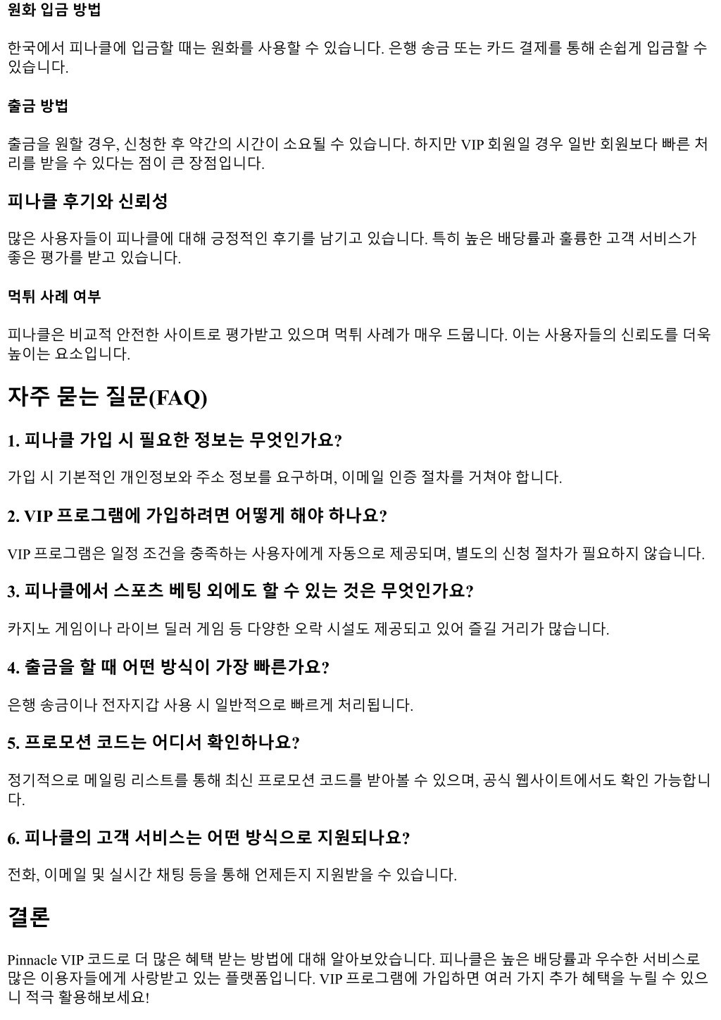 2. 원화입금방법 한국에서피나클에입금할때는원화를사용할수있습니다. 은행송금또는카드결제를통해손쉽게입금할수 있습니다. 출금방법 출금을원할경우, 신청한후약간의시간이소요될수있습니다. 하지만 VIP 회원일경우일반회원보다빠른처 리를받을수있다는점이큰장점입니다. 피나클후기와신뢰성 많은사용자들이피나클에대해긍정적인후기를남기고있습니다. 특히높은배당률과훌륭한고객서비스가 좋은평가를받고있습니다. 먹튀사례여부 피나클은비교적안전한사이트로평가받고있으며먹튀사례가매우드뭅니다. 이는사용자들의신뢰도를더욱 높이는요소입니다. 자주묻는질문(FAQ) 1. 피나클가입시필요한정보는무엇인가요? 가입시기본적인개인정보와주소정보를요구하며, 이메일인증절차를거쳐야합니다. 2. VIP 프로그램에가입하려면어떻게해야하나요? VIP 프로그램은일정조건을충족하는사용자에게자동으로제공되며, 별도의신청절차가필요하지않습니다. 3. 피나클에서스포츠베팅외에도할수있는것은무엇인가요? 카지노게임이나라이브딜러게임등다양한오락시설도제공되고있어즐길거리가많습니다. 4. 출금을할때어떤방식이가장빠른가요? 은행송금이나전자지갑사용시일반적으로빠르게처리됩니다. 5. 프로모션코드는어디서확인하나요? 정기적으로메일링리스트를통해최신프로모션코드를받아볼수있으며, 공식웹사이트에서도확인가능합니 다. 6. 피나클의고객서비스는어떤방식으로지원되나요? 전화, 이메일및실시간채팅등을통해언제든지지원받을수있습니다. 결론 Pinnacle VIP 코드로더많은혜택받는방법에대해알아보았습니다. 피나클은높은배당률과우수한서비스로 많은이용자들에게사랑받고있는플랫폼입니다. VIP 프로그램에가입하면여러가지추가혜택을누릴수있으 니적극활용해보세요!