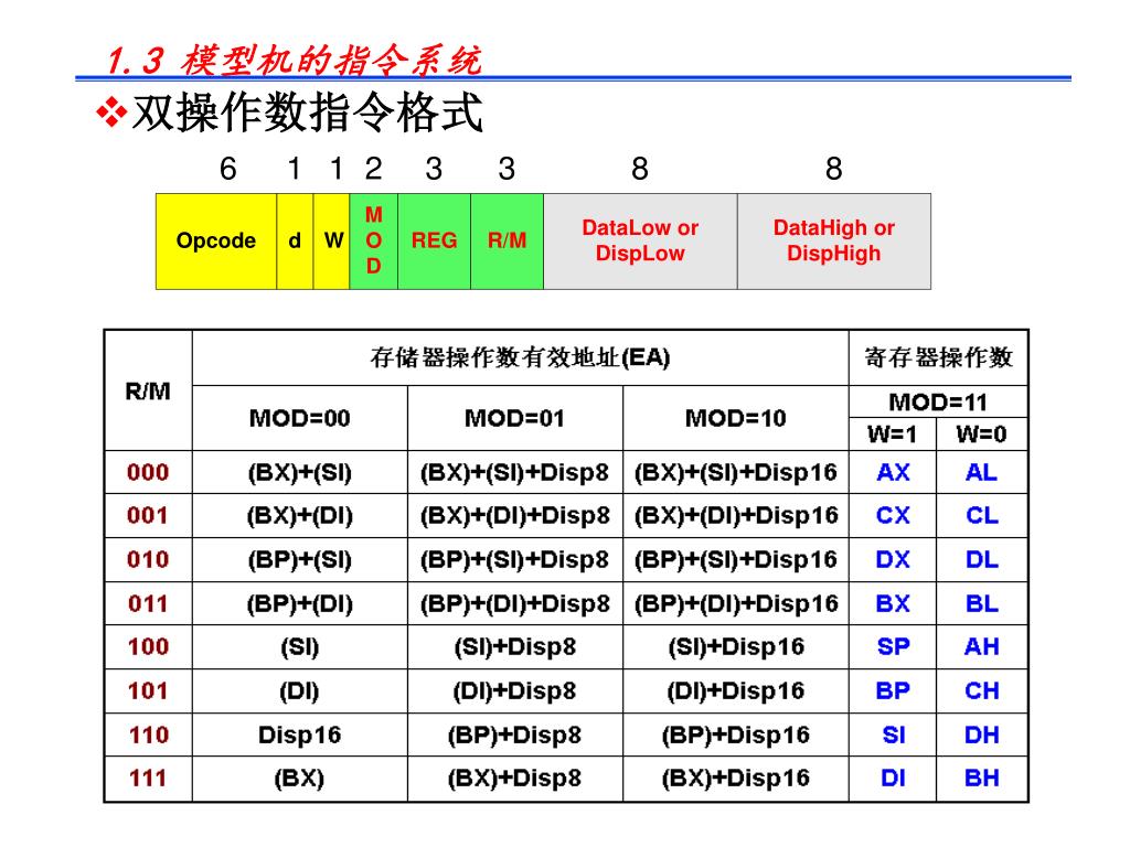 REG W=1 W=0 000 AX AL 001 CX CL 010 DX DL 011 BX BL 寄存器编码表 100 SP AH 101 BP CH 110 SI DH 111 DI BH 1.3 模型机的指令系统 • 双操作数指令格式