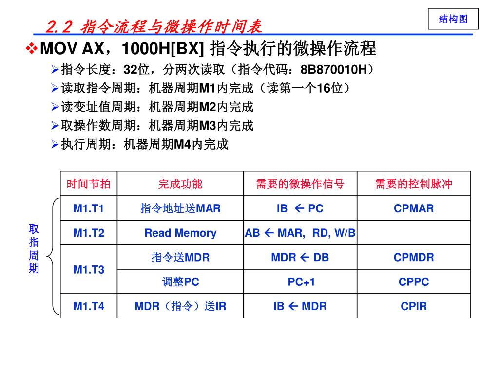 时间节拍 完成功能 需要的微操作信号 需要的控制脉冲 M1.T1 指令地址送MAR IB PC CPMAR 取指周期 M1.T2 Read Memory AB MAR, RD, W/B M1.T3 指令送MDR MDR DB CPMDR 调整PC PC+1 CPPC M1.T4 MDR(指令)送IR IB MDR CPIR 结构图 2.2 指令流程与微操作时间表 • MOV AX,1000H[BX] 指令执行的微操作流程 • 指令长度:32位,分两次读取(指令代码:8B870010H) • 读取指令周期:机器周期M1内完成(读第一个16位) • 读变址值周期:机器周期M2内完成 • 取操作数周期:机器周期M3内完成 • 执行周期:机器周期M4内完成