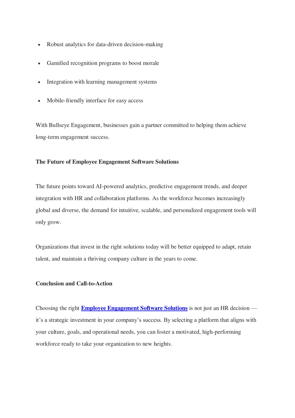 Robust analytics for data-driven decision-making Gamified recognition programs to boost morale Integration with learning management systems Mobile-friendly interface for easy access With Bullseye Engagement, businesses gain a partner committed to helping them achieve long-term engagement success. The Future of Employee Engagement Software Solutions The future points toward AI-powered analytics, predictive engagement trends, and deeper integration with HR and collaboration platforms. As the workforce becomes increasingly global and diverse, the demand for intuitive, scalable, and personalized engagement tools will only grow. Organizations that invest in the right solutions today will be better equipped to adapt, retain talent, and maintain a thriving company culture in the years to come. Conclusion and Call-to-Action Choosing the right Employee Engagement Software Solutions is not just an HR decision — it’s a strategic investment in your company’s success. By selecting a platform that aligns with your culture, goals, and operational needs, you can foster a motivated, high-performing workforce ready to take your organization to new heights.