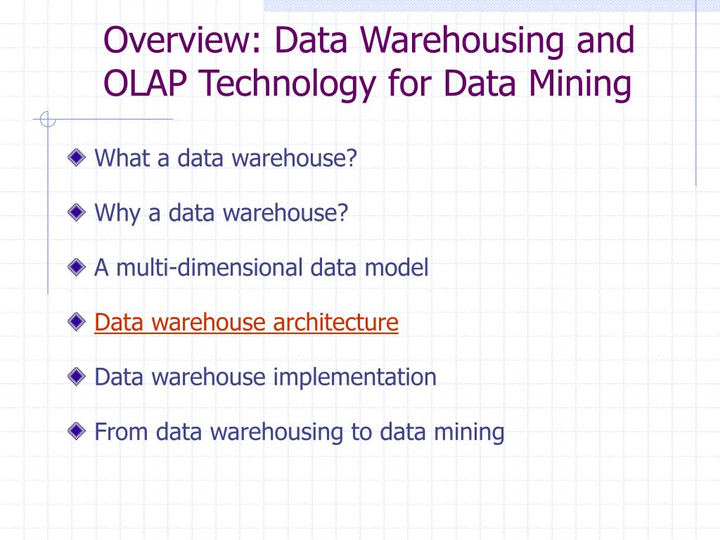 Overview: Data Warehousing and OLAP Technology for Data Mining • What a data warehouse? • Why a data warehouse? • A multi-dimensional data model • Data warehouse architecture • Data warehouse implementation • From data warehousing to data mining