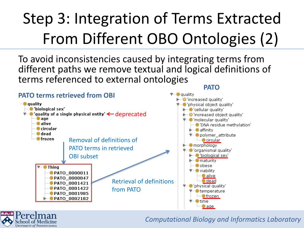 Step 3: Integration of Terms Extracted From Different OBO Ontologies (2) To avoid inconsistencies caused by integrating terms from different paths we remove textual and logical definitions of terms referenced to external ontologies PATO PATO terms retrieved from OBI deprecated Removal of definitions of PATO terms in retrieved OBI subset Retrieval of definitions from PATO