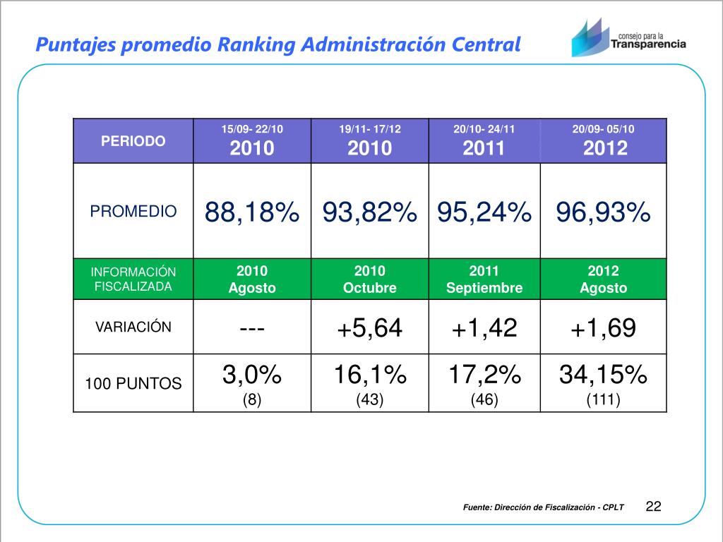 Puntajes promedio Ranking Administración Central Fuente: Dirección de Fiscalización - CPLT