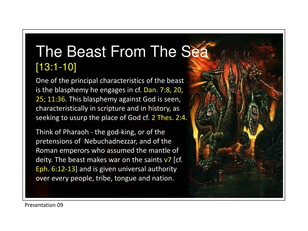 The Beast From The Sea [13:1-10] One of the principal characteristics of the beast is the blasphemy he engages in cf. Dan. 7:8, 20, 25; 11:36. This blasphemy against God is seen, characteristically in scripture and in history, as seeking to usurp the place of God cf. 2 Thes. 2:4. Think of Pharaoh - the god-king, or of the pretensions of Nebuchadnezzar, and of the Roman emperors who assumed the mantle of deity. The beast makes war on the saints v7 [cf. Eph. 6:12-13] and is given universal authority over every people, tribe, tongue and nation. Presentation 09