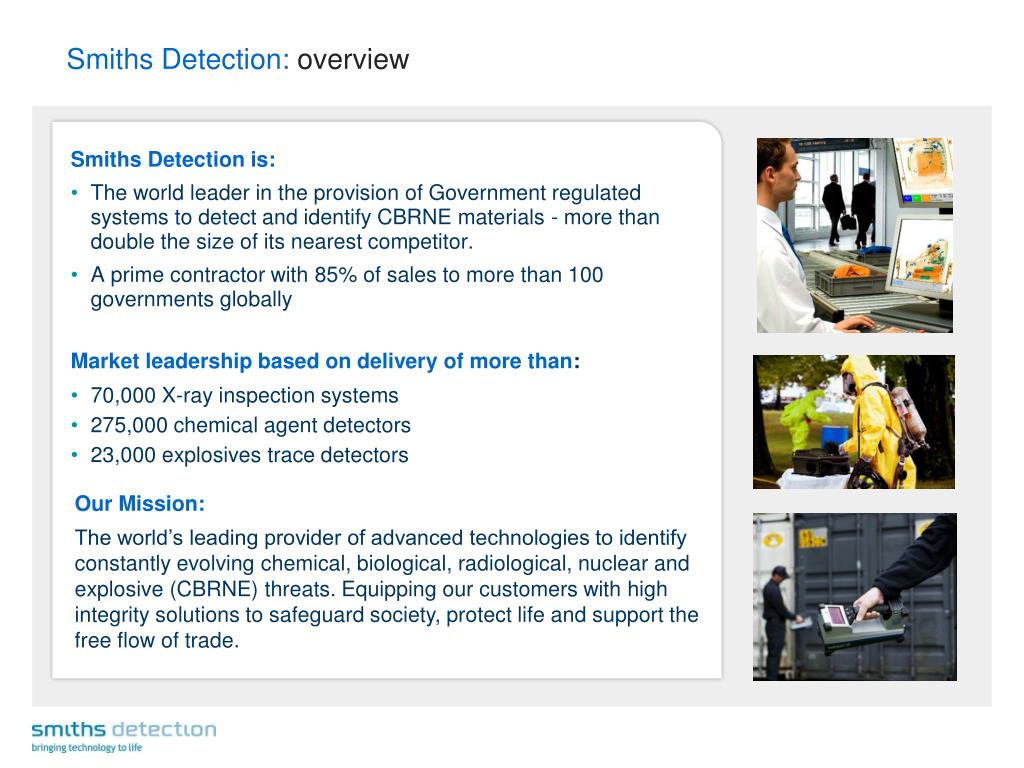 Smiths Detection: overview Smiths Detection is: The world leader in the provision of Government regulated systems to detect and identify CBRNE materials - more than double the size of its nearest competitor. A prime contractor with 85% of sales to more than 100 governments globally • Market leadership based on delivery of more than: • 70,000 X-ray inspection systems • 275,000 chemical agent detectors • 23,000 explosives trace detectors OurMission: The world’s leading provider of advanced technologies to identify constantly evolving chemical, biological, radiological, nuclear and explosive (CBRNE) threats. Equipping our customers with high integrity solutions to safeguard society, protect life and support the free flow of trade.