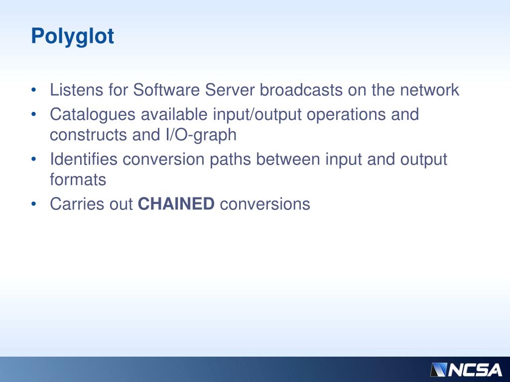 Polyglot • Listens for Software Server broadcasts on the network • Catalogues available input/output operations and constructs and I/O-graph • Identifies conversion paths between input and output formats • Carries out CHAINED conversions