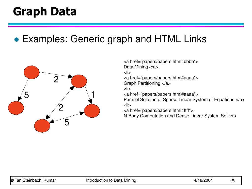 Types of data sets • Record • Data Matrix • Document Data • Transaction Data • Graph • World Wide Web • Molecular Structures • Ordered • Spatial Data • Temporal Data • Sequential Data • Genetic Sequence Data