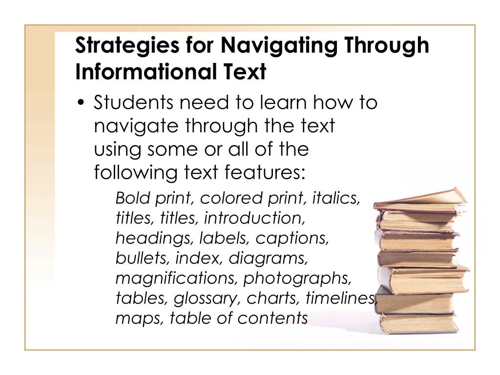 Strategies for Navigating Through Informational Text • Students need to learn how to navigate through the text using some or all of the following text features: Bold print, colored print, italics, titles, titles, introduction, headings, labels, captions, bullets, index, diagrams, magnifications, photographs, tables, glossary, charts, timelines, maps, table of contents