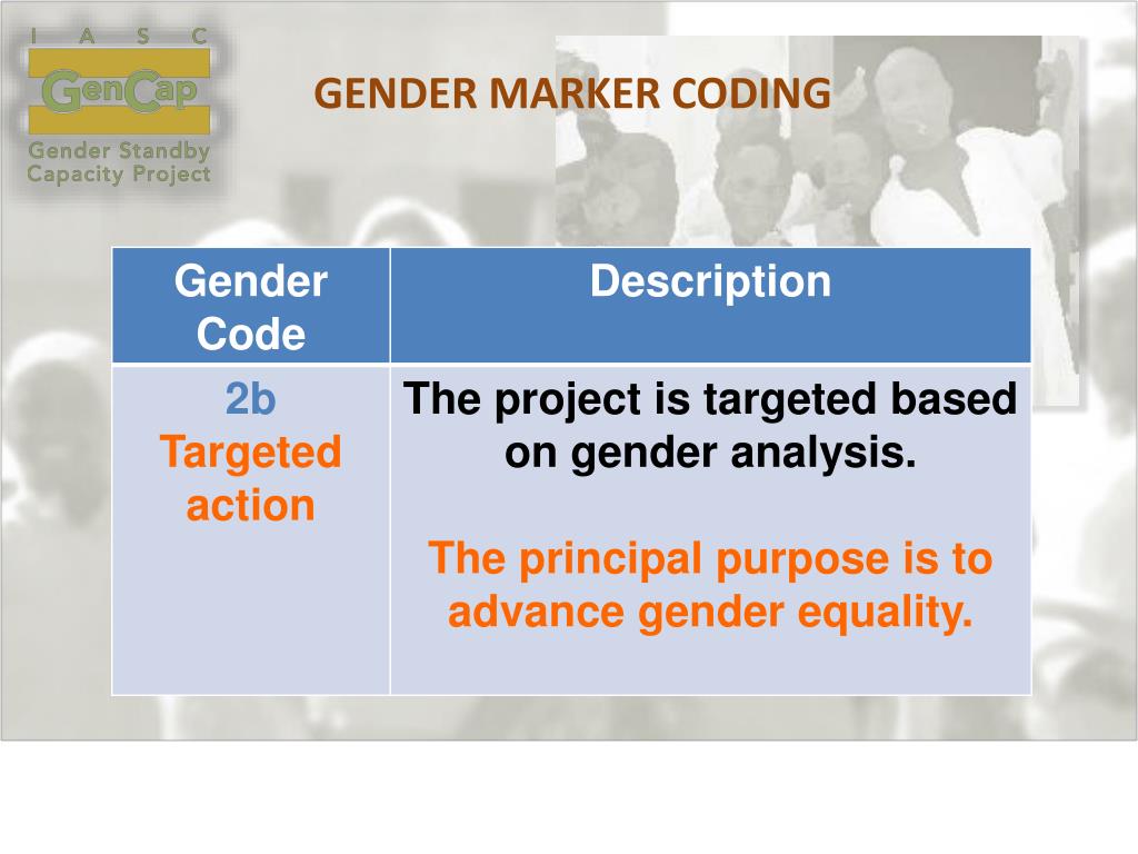 GENDER MARKER A SIMPLE and PRACTICAL tool; • To measure/track inclusion of gender and GBV in projects. • To enable humanitarian teams to ensure women and men, boys and girls benefit equally from assistance. • Requirement in humanitarian appeals. Or more accurately, the “Who benefits marker”