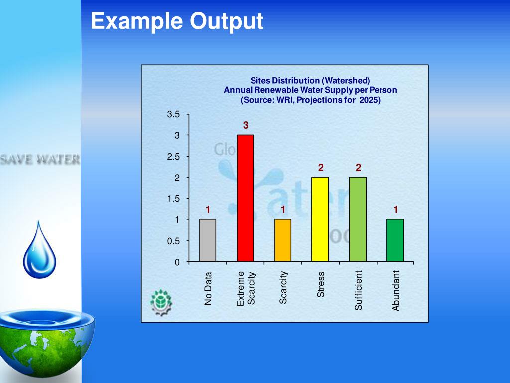 Global Water Tool® • World Business Council for Sustainable Development (WBCSD) • Tool to estimate business risk from water scarcity • Locate Corporate facilities in water-scarce areas • Employees in countries lacking access to water or sanitation • Suppliers in water-scarce areas • Excel workbook and mapping tool