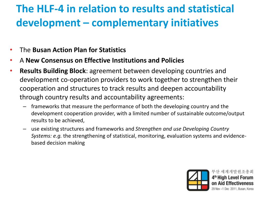 The HLF-4 in relation to results and statistical development – complementary initiatives • The Busan Action Plan for Statistics • A New Consensus on Effective Institutions and Policies • Results Building Block: agreement between developing countries and development co-operation providers to work together to strengthen their cooperation and structures to track results and deepen accountability through country results and accountability agreements: • frameworks that measure the performance of both the developing country and the development cooperation provider, with a limited number of sustainable outcome/output results to be achieved, • use existing structures and frameworks and Strengthen and use Developing Country Systems: e.g. the strengthening of statistical, monitoring, evaluation systems and evidence-based decision making