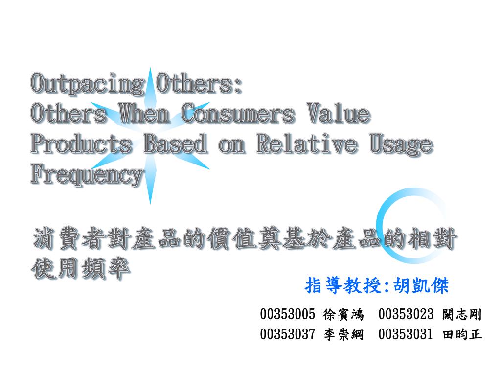 Outpacing Others:Others When Consumers Value Products Based on Relative Usage Frequency消費者對產品的價值奠基於產品的相對使用頻率 指導教授:胡凱傑 00353005 徐賓鴻 00353023 闕志剛 00353037 李崇綱 00353031 田昀正