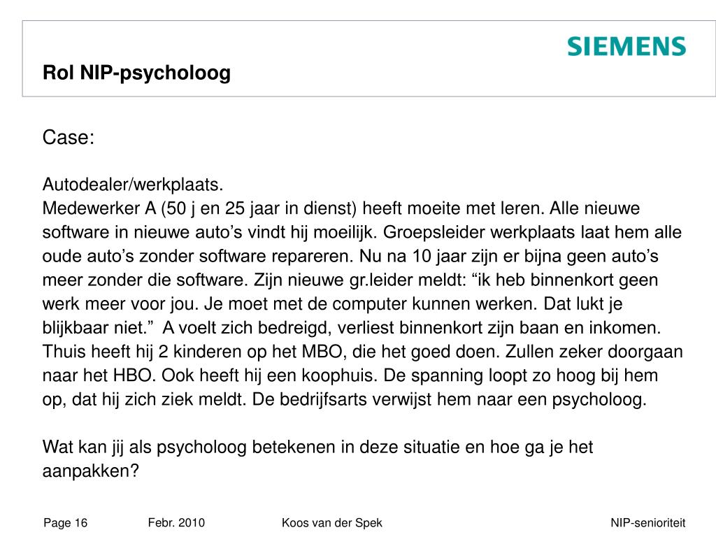 Rol NIP-psycholoog • Case: • Autodealer/werkplaats. • Medewerker A (50 j en 25 jaar in dienst) heeft moeite met leren. Alle nieuwe software in nieuwe auto’s vindt hij moeilijk. Groepsleider werkplaats laat hem alle oude auto’s zonder software repareren. Nu na 10 jaar zijn er bijna geen auto’s meer zonder die software. Zijn nieuwe gr.leider meldt: “ik heb binnenkort geen werk meer voor jou. Je moet met de computer kunnen werken. Dat lukt je blijkbaar niet.” A voelt zich bedreigd, verliest binnenkort zijn baan en inkomen. Thuis heeft hij 2 kinderen op het MBO, die het goed doen. Zullen zeker doorgaan naar het HBO. Ook heeft hij een koophuis. De spanning loopt zo hoog bij hem op, dat hij zich ziek meldt. De bedrijfsarts verwijst hem naar een psycholoog. • Wat kan jij als psycholoog betekenen in deze situatie en hoe ga je het aanpakken?