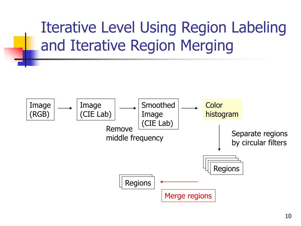 Iterative Level Using Region Labeling and Iterative Region Merging Image (RGB) Image (CIE Lab) Smoothed Image (CIE Lab) Color histogram Remove middle frequency Separate regions by circular filters Regions Regions Regions Regions Regions Regions Merge regions