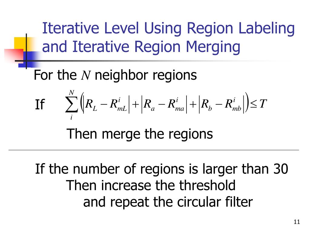 Iterative Level Using Region Labeling and Iterative Region Merging For the N neighbor regions If Then merge the regions If the number of regions is larger than 30 Then increase the threshold and repeat the circular filter