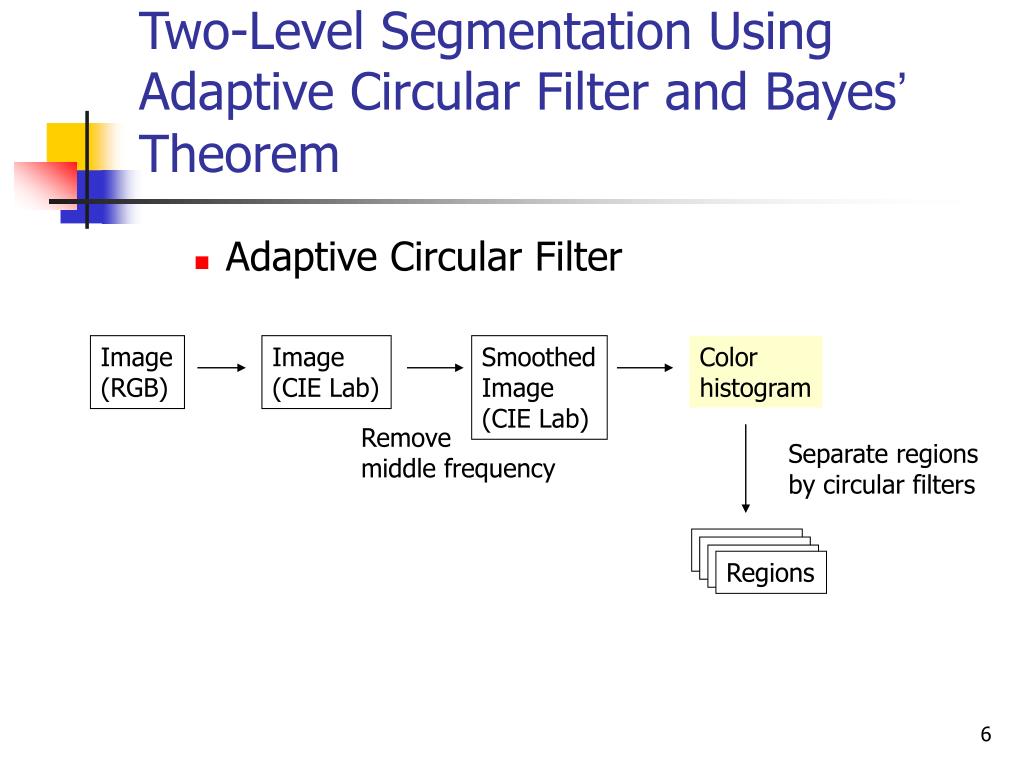 Two-Level Segmentation Using Adaptive Circular Filter and Bayes’ Theorem • Adaptive Circular Filter Image (RGB) Image (CIE Lab) Smoothed Image (CIE Lab) Color histogram Remove middle frequency Separate regions by circular filters Regions Regions Regions Regions