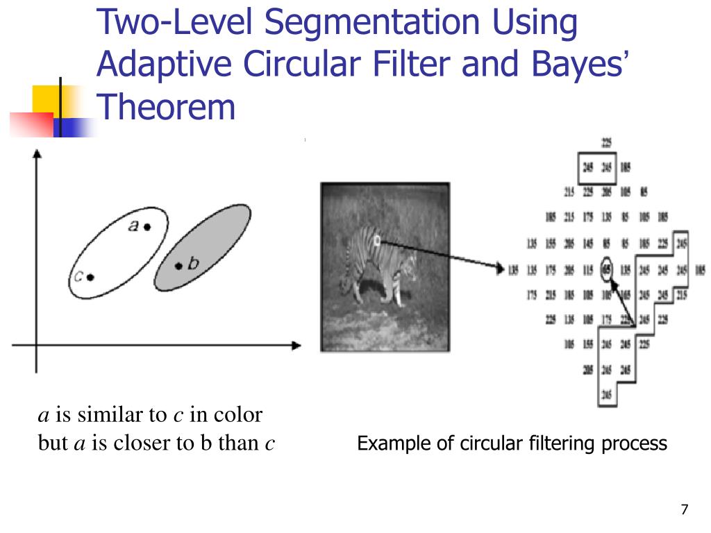 Two-Level Segmentation Using Adaptive Circular Filter and Bayes’ Theorem a is similar to c in color but a is closer to b than c Example of circular filtering process