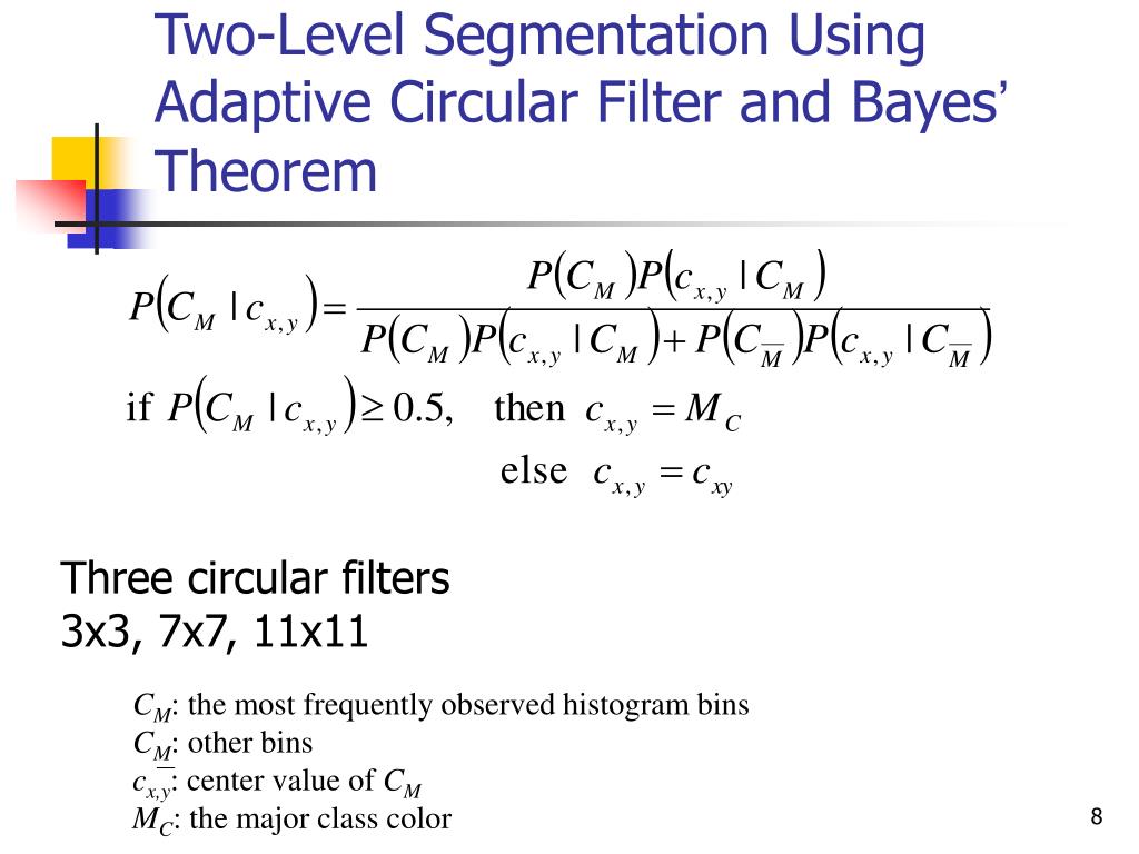 Two-Level Segmentation Using Adaptive Circular Filter and Bayes’ Theorem Three circular filters 3x3, 7x7, 11x11 CM: the most frequently observed histogram bins CM: other bins cx,y: center value of CM MC: the major class color