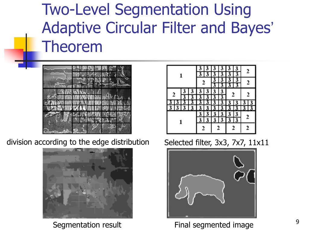 Two-Level Segmentation Using Adaptive Circular Filter and Bayes’ Theorem division according to the edge distribution Selected filter, 3x3, 7x7, 11x11 Segmentation result Final segmented image