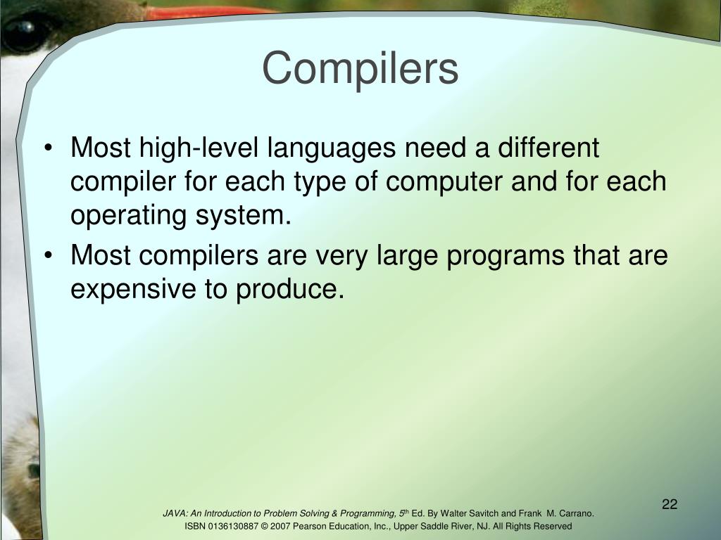 Compilers • Most high-level languages need a different compiler for each type of computer and for each operating system. • Most compilers are very large programs that are expensive to produce.