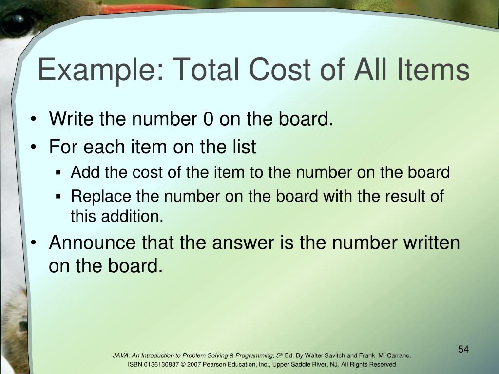 Example: Total Cost of All Items • Write the number 0 on the board. • For each item on the list • Add the cost of the item to the number on the board • Replace the number on the board with the result of this addition. • Announce that the answer is the number written on the board.