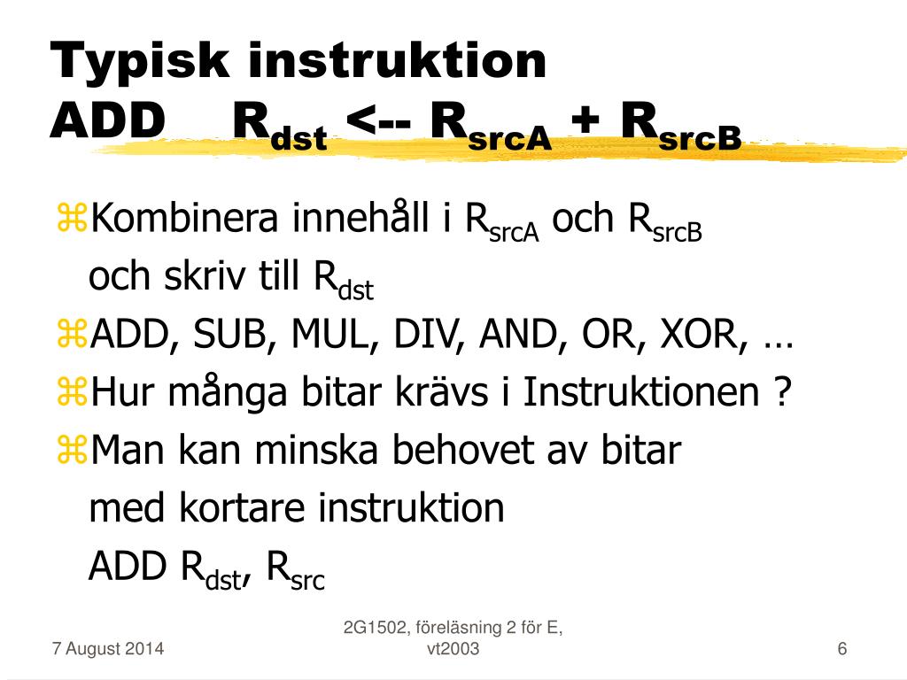 Typisk instruktionADD Rdst <-- RsrcA + RsrcB • Kombinera innehåll i RsrcA och RsrcB och skriv till Rdst • ADD, SUB, MUL, DIV, AND, OR, XOR, … • Hur många bitar krävs i Instruktionen ? • Man kan minska behovet av bitar med kortare instruktion ADD Rdst, Rsrc 2G1502, föreläsning 2 för E, vt2003
