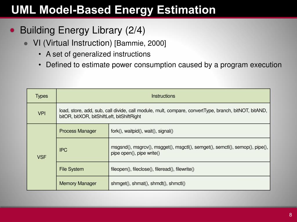 UML Model-Based Energy Estimation • Building Energy Library (2/4) • VI (Virtual Instruction) [Bammie, 2000] • A set of generalized instructions • Defined to estimate power consumption caused by a program execution