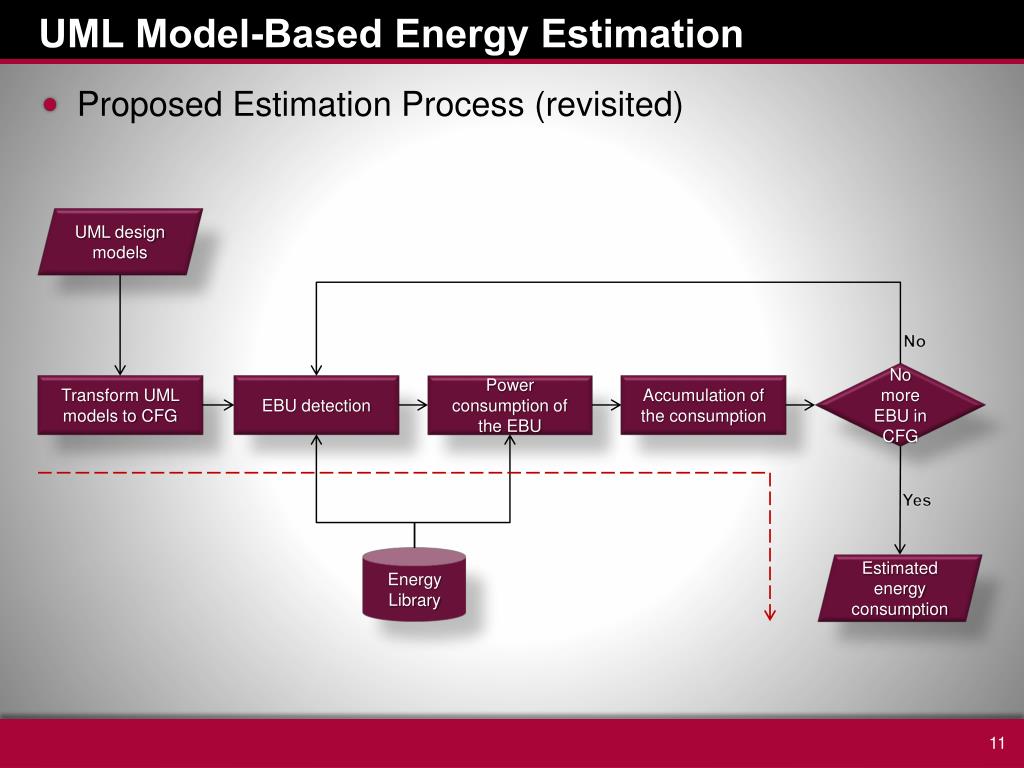 UML Model-Based Energy Estimation • Proposed Estimation Process UML design models No No more EBU in CFG Transform UML models to CFG EBU detection Power consumption of the EBU Accumulation of the consumption Yes Energy Library Estimated energy consumption