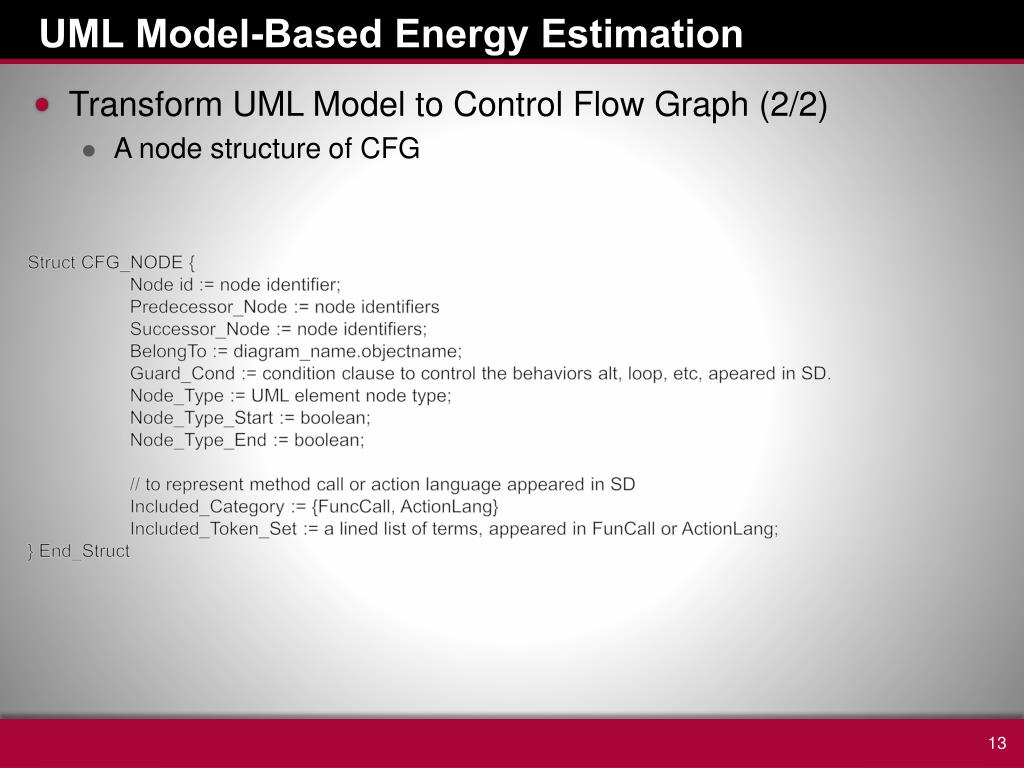 UML Model-Based Energy Estimation • Transform UML Model to Control Flow Graph (2/2) • A node structure of CFG Struct CFG_NODE { Node id := node identifier; Predecessor_Node := node identifiers Successor_Node := node identifiers; BelongTo := diagram_name.objectname; Guard_Cond := condition clause to control the behaviors alt, loop, etc, apeared in SD. Node_Type := UML element node type; Node_Type_Start := boolean; Node_Type_End := boolean; // to represent method call or action language appeared in SD Included_Category := {FuncCall, ActionLang} Included_Token_Set := a lined list of terms, appeared in FunCallor ActionLang; } End_Struct