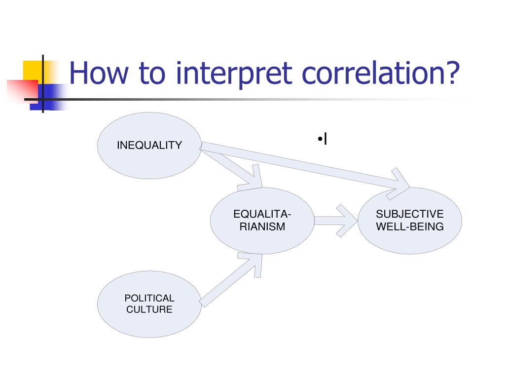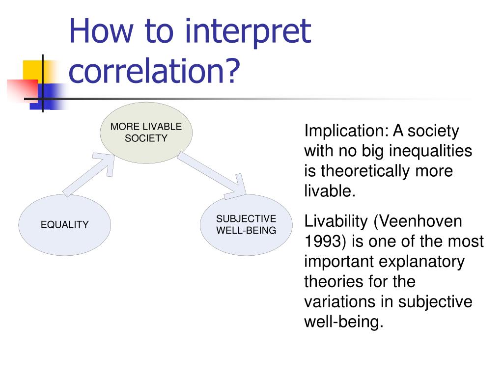How to interpret correlation? Implication: A society with no big inequalities is theoreticallymore livable. Livability (Veenhoven 1993) is one of the most important explanatory theories for the variations in subjective well-being.