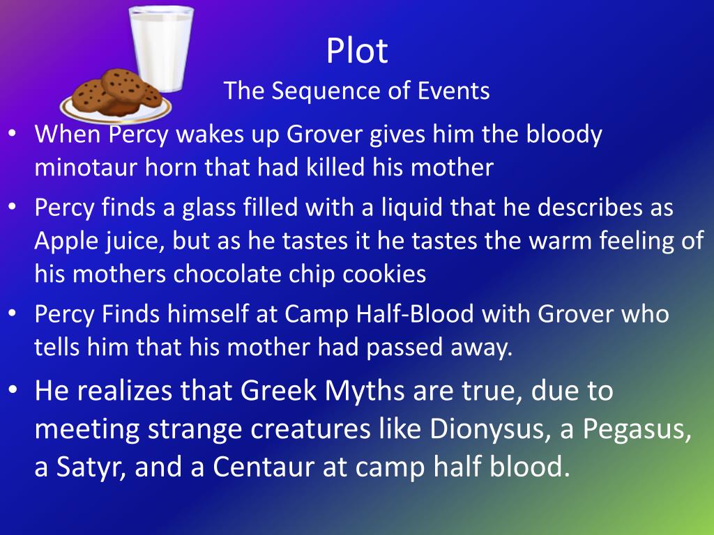 PlotThe Sequence of Events • When Percy wakes up Grover gives him the bloody minotaur horn that had killed his mother • Percy finds a glass filled with a liquid that he describes as Apple juice, but as he tastes it he tastes the warm feeling of his mothers chocolate chip cookies • Percy Finds himself at Camp Half-Blood with Grover who tells him that his mother had passed away. • He realizes that Greek Myths are true, due to meeting strange creatures like Dionysus, a Pegasus, a Satyr, and a Centaur at camp half blood.