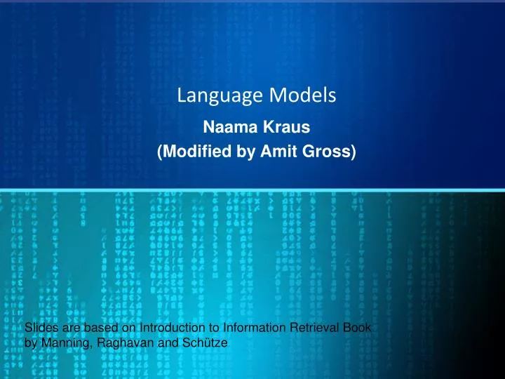 Language Models NaamaKraus (Modified by Amit Gross) Slides are based on Introduction to Information Retrieval Book by Manning, Raghavan and Schütze