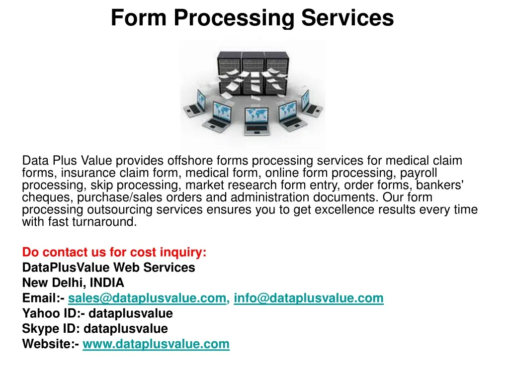 Form Processing Services Data Plus Value provides offshore forms processing services for medical claim forms, insurance claim form, medical form, online form processing, payroll processing, skip processing, market research form entry, order forms, bankers' cheques, purchase/sales orders and administration documents. Our form processing outsourcing services ensures you to get excellence results every time with fast turnaround. Do contact us for cost inquiry: DataPlusValue Web Services New Delhi, INDIA Email:- sales@dataplusvalue.com, info@dataplusvalue.com Yahoo ID:- dataplusvalue Skype ID: dataplusvalue Website:- www.dataplusvalue.com