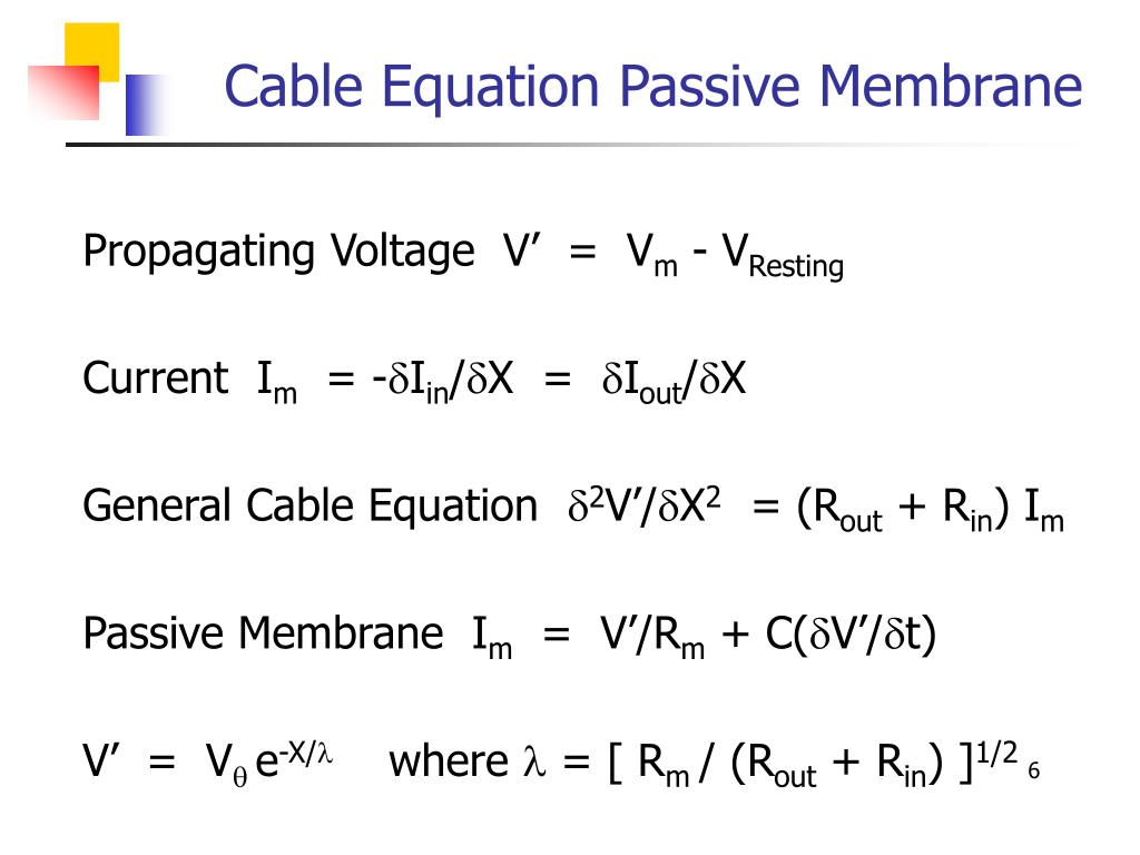 Cable Equation (Passive) - continued • General Cable Equation d2V’/dX2 = (Rout + Rin) Im • Passive Membrane Im = V’/Rm + C(dV’/dt) • Action Potential Equation (by substituting from above) • (Rout + Rin)-1 d2V’/dX2 = V’/Rm + C(dV’/dt)