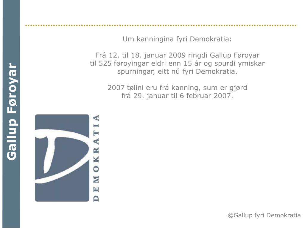 Kanning fyri Demokratia. Um kanningina fyri Demokratia: Frá 12. til 18. januar 2009 ringdi Gallup Føroyar til 525 føroyingar eldri enn 15 ár og spurdi ymiskar spurningar, eitt nú fyri Demokratia. 2007 tølini eru frá kanning, sum er gjørd frá 29. januar til 6 februar 2007.