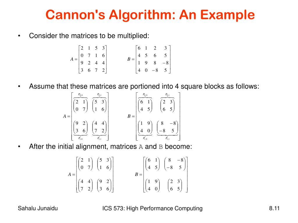 Cannon's Algorithm: An Example • Consider the matrices to be multiplied: • Assume that these matrices are portioned into 4 square blocks as follows: • After the initial alignment, matrices A and B become: ICS 573: High Performance Computing