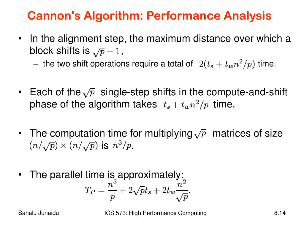 Cannon's Algorithm: Performance Analysis • In the alignment step, the maximum distance over which a block shifts is , • the two shift operations require a total of time. • Each of the single-step shifts in the compute-and-shift phase of the algorithm takes time. • The computation time for multiplying matrices of size is . • The parallel time is approximately: ICS 573: High Performance Computing