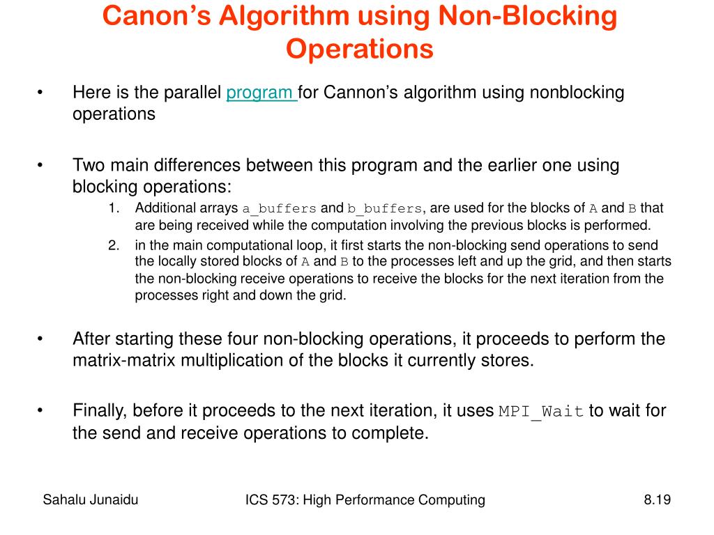 Canon’s Algorithm using Non-Blocking Operations • Here is the parallel program for Cannon’s algorithm using nonblocking operations • Two main differences between this program and the earlier one using blocking operations: • Additional arrays a_buffers and b_buffers, are used for the blocks of A and B that are being received while the computation involving the previous blocks is performed. • in the main computational loop, it first starts the non-blocking send operations to send the locally stored blocks of A and B to the processes left and up the grid, and then starts the non-blocking receive operations to receive the blocks for the next iteration from the processes right and down the grid. • After starting these four non-blocking operations, it proceeds to perform the matrix-matrix multiplication of the blocks it currently stores. • Finally, before it proceeds to the next iteration, it uses MPI_Wait to wait for the send and receive operations to complete. ICS 573: High Performance Computing
