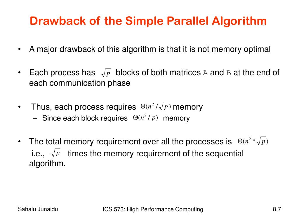 Drawback of the Simple Parallel Algorithm • A major drawback of this algorithm is that it is not memory optimal • Each process has blocks of both matrices A and B at the end of each communication phase • Thus, each process requires memory • Since each block requires memory • The total memory requirement over all the processes is i.e., times the memory requirement of the sequential algorithm. ICS 573: High Performance Computing