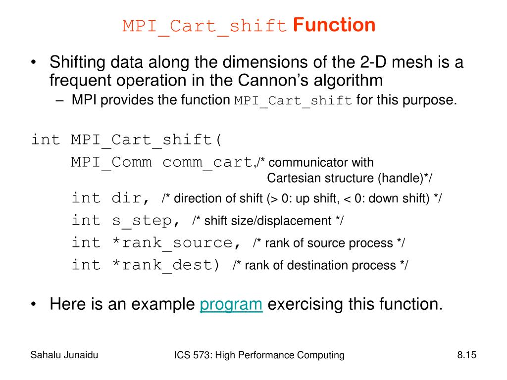 MPI_Cart_shift Function • Shifting data along the dimensions of the 2-D mesh is a frequent operation in the Cannon’s algorithm • MPI provides the function MPI_Cart_shift for this purpose. int MPI_Cart_shift( MPI_Comm comm_cart,/* communicator with Cartesian structure (handle)*/ int dir, /* direction of shift (> 0: up shift, < 0: down shift) */ int s_step, /* shift size/displacement */ int *rank_source, /* rank of source process */ int *rank_dest) /* rank of destination process */ • Here is an example program exercising this function. ICS 573: High Performance Computing