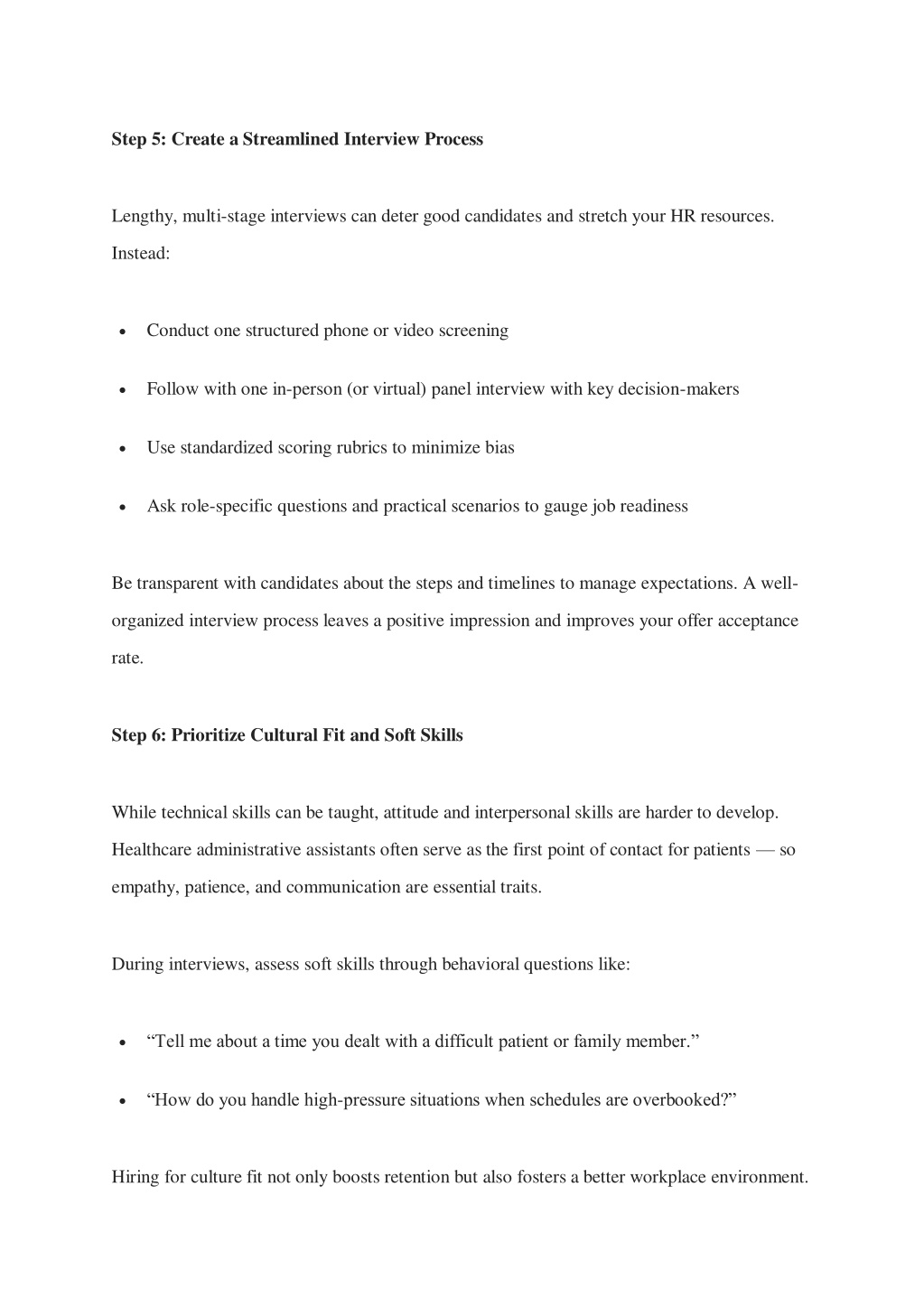Step 5: Create a Streamlined Interview Process Lengthy, multi-stage interviews can deter good candidates and stretch your HR resources. Instead: Conduct one structured phone or video screening Follow with one in-person (or virtual) panel interview with key decision-makers Use standardized scoring rubrics to minimize bias Ask role-specific questions and practical scenarios to gauge job readiness Be transparent with candidates about the steps and timelines to manage expectations. A well- organized interview process leaves a positive impression and improves your offer acceptance rate. Step 6: Prioritize Cultural Fit and Soft Skills While technical skills can be taught, attitude and interpersonal skills are harder to develop. Healthcare administrative assistants often serve as the first point of contact for patients — so empathy, patience, and communication are essential traits. During interviews, assess soft skills through behavioral questions like: “Tell me about a time you dealt with a difficult patient or family member.” “How do you handle high-pressure situations when schedules are overbooked?” Hiring for culture fit not only boosts retention but also fosters a better workplace environment.