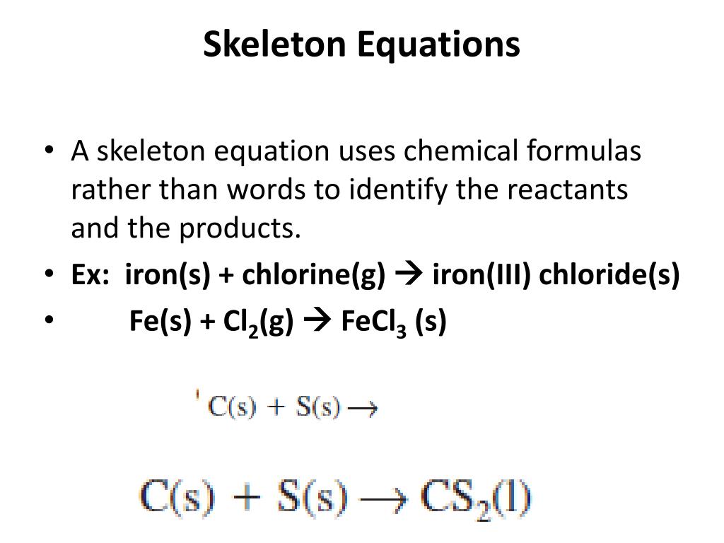 Skeleton Equations • A skeleton equation uses chemical formulas rather than words to identify the reactants and the products. • Ex:iron(s) + chlorine(g) iron(III) chloride(s) • Fe(s) + Cl2(g) FeCl3 (s)