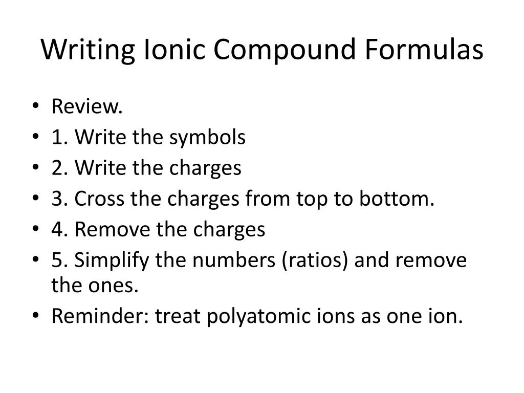 Writing Ionic Compound Formulas • Review. • 1. Write the symbols • 2. Write the charges • 3. Cross the charges from top to bottom. • 4. Remove the charges • 5. Simplify the numbers (ratios) and remove the ones. • Reminder: treat polyatomic ions as one ion.