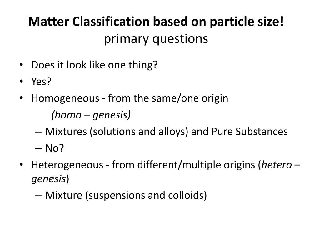 Matter Classification based on particle size!primary questions • Does it look like one thing? • Yes? • Homogeneous - from the same/one origin (homo – genesis) • Mixtures (solutions and alloys) and Pure Substances • No? • Heterogeneous - from different/multiple origins (hetero – genesis) • Mixture (suspensions and colloids)