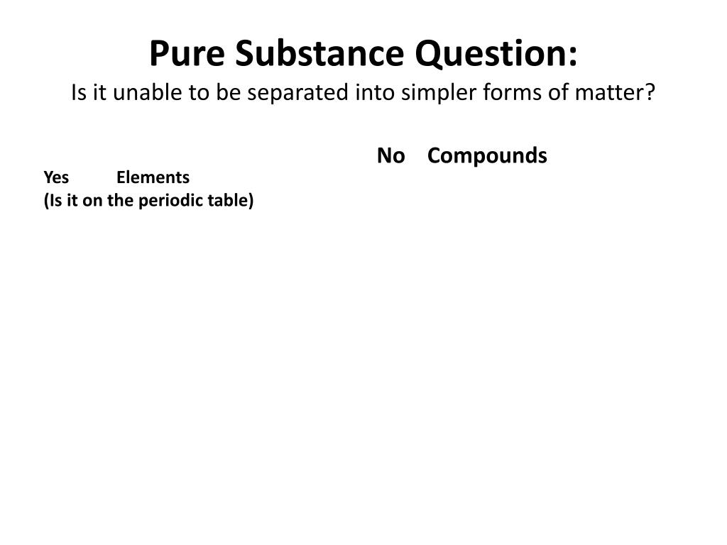 No Compounds Pure Substance Question:Is it unable to be separated into simpler forms of matter? Yes Elements (Is it on the periodic table)