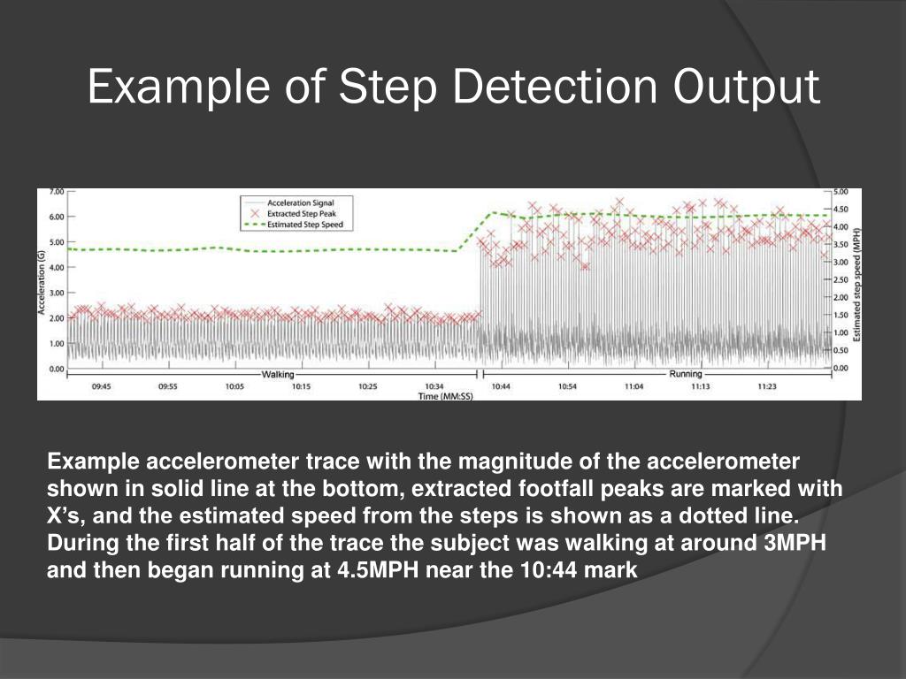 Example of Step Detection Output Example accelerometer trace with the magnitude of the accelerometer shown in solid line at the bottom, extracted footfall peaks are marked with X’s, and the estimated speed from the steps is shown as a dotted line. During the first half of the trace the subject was walking at around 3MPH and then began running at 4.5MPH near the 10:44 mark