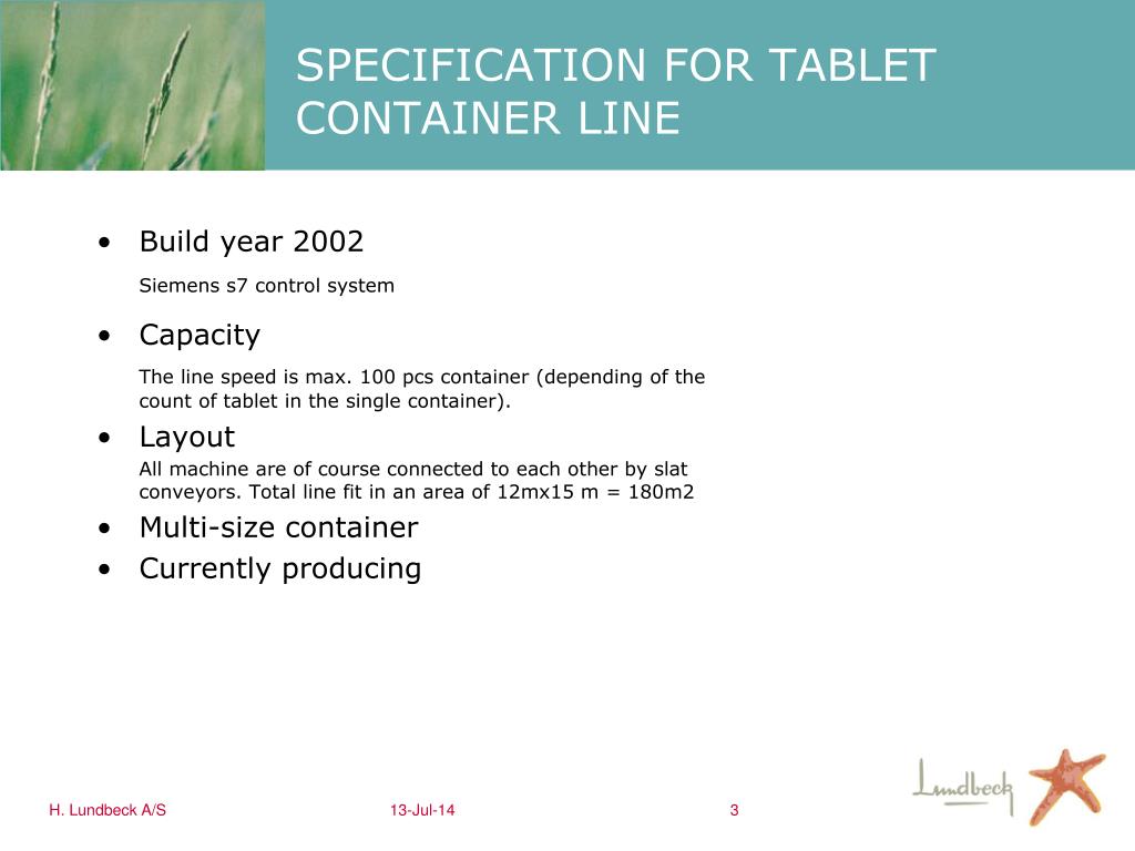 Build year 2002 Siemens s7 control system Capacity The line speed is max. 100 pcs container (depending of the count of tablet in the single container). Layout All machine are of course connected to each other by slat conveyors. Total line fit in an area of 12mx15 m = 180m2 Multi-size container Currently producing SPECIFICATION FOR TABLET CONTAINER LINE H. Lundbeck A/S13-Jul-143