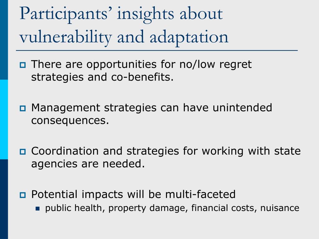 Participants’ insights about vulnerability and adaptation • There are opportunities for no/low regret strategies and co-benefits. • Management strategies can have unintended consequences. • Coordination and strategies for working with state agencies are needed. • Potential impacts will be multi-faceted • public health, property damage, financial costs, nuisance
